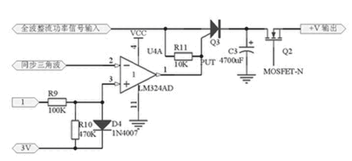 圖5所示的電路中,延時(shí)比較開(kāi)關(guān)由運(yùn)算放大器U4A組成。同步三角波輸入到運(yùn)算放大器U4A的反相輸入端,差壓比較兼積分濾波電路的輸出電壓加到運(yùn)算放大器U4A的同相輸入端進(jìn)行比較、整形。