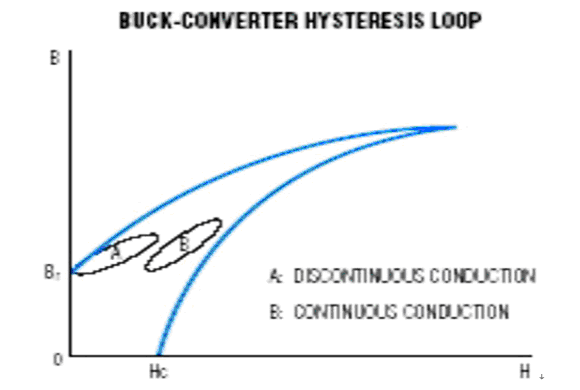磁芯損耗主要是由于磁滯現(xiàn)象以及磁芯內(nèi)部傳導(dǎo)率或其他非線性參數(shù)的互感產(chǎn)生。在Buck拓?fù)浣Y(jié)構(gòu)中,第一象限的B-H磁滯回線對(duì)磁芯損耗影響最大。在第一象限這個(gè)局部圖中,磁滯回線顯示了電感從初始電感量過(guò)渡到峰值電感量再回到初始電感量的過(guò)程。如果開(kāi)關(guān)電源穩(wěn)定工作在不連續(xù)狀態(tài),磁滯回線會(huì)從剩余電感量(Br)過(guò)渡到峰值電感量(參考圖1)。如果開(kāi)關(guān)電源工作在連續(xù)狀態(tài),那么磁滯回線將會(huì)從直流偏置點(diǎn)上升到曲線峰值,再回到直流偏置點(diǎn)。通過(guò)實(shí)驗(yàn)可以確定磁滯回線的精確曲線形狀(基本上是橢圓曲線)。