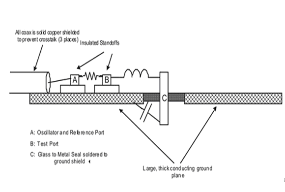測(cè)試電感性能的最有效方法就是將被測(cè)試電感放置在最終開(kāi)關(guān)電源電路上,然后對(duì)此電路的效率進(jìn)行測(cè)量。但是,這種測(cè)試方法需要有最終電路,不易采用?,F(xiàn)在,有一種相對(duì)簡(jiǎn)單的測(cè)試方法,可以在設(shè)計(jì)開(kāi)關(guān)電源前對(duì)電感的磁芯損耗進(jìn)行測(cè)試(在其設(shè)定的開(kāi)關(guān)頻點(diǎn)上)。首先,將磁芯串連放置在低損耗電容介質(zhì)上(比如鍍銀云母)。然后,用一系列共振模驅(qū)動(dòng)。其中介質(zhì)的電容值需要與被測(cè)電感的開(kāi)關(guān)頻率一致。最后采用網(wǎng)絡(luò)分析儀來(lái)完成整個(gè)測(cè)試過(guò)程(信號(hào)發(fā)生器加上一個(gè)射頻伏特計(jì)或者功率計(jì)也可以完成測(cè)試)。測(cè)試設(shè)備的結(jié)構(gòu)如圖2所示。