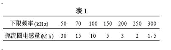 L1用于濾除低頻共態(tài)噪聲,它的磁芯一般采用高頻鐵氧體磁性材料。由于鐵氧體磁性材料沒有渦流的影響,高頻率仍能保持較高的導磁率,缺點是弱磁場容易飽和,但是L1在繞制時采用雙線并繞的方式,即在一個閉合磁路的磁芯上繞制相同電感量的兩個繞阻,電源電流經(jīng)兩個繞阻產(chǎn)生相反磁通,相互抵消,防止磁芯飽和。對于共態(tài)噪聲?;ジ邢禂?shù)產(chǎn)生磁通相互增強,即電感量增強,能很好的抑制共態(tài)噪聲。L1的共態(tài)扼流圈的電感量一般由所要抑制的噪聲電平的下限頻率(DC/DC轉(zhuǎn)換模塊的基波頻率)確定,下限頻率越高,所需要的電感量越小,粗略對應(yīng)值見表1。