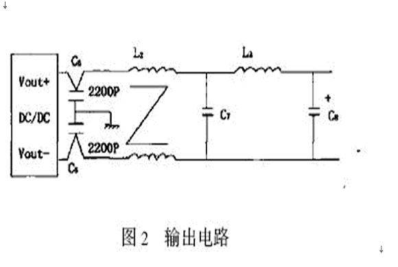 二次電源的輸出高頻噪聲(表現(xiàn)為紋波)可能向空間輻射成為輻射噪聲,過大時造成作為負載的電子設(shè)備出現(xiàn)故障。為此,二次直流電源的輸出應(yīng)包括平滑電路和EMI濾波電路。電路圖如圖2所示。