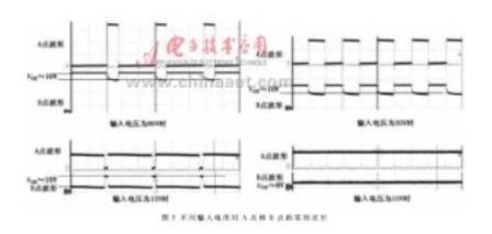 圖5為當輸出電壓為10V、電流為2A時,在不同輸入電壓狀態(tài)下,圖3中A點和B點的實測波形。由圖5可知,當輸入電壓為13V時,MOSFET關斷時間很短,當輸入電壓為10V時,MOSFET則一直導通。
