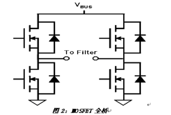 濾波之后,輸出橋產(chǎn)生一個(gè)50Hz的正弦電壓及電流信號(hào)。一種常見(jiàn)的實(shí)現(xiàn)方案是采用標(biāo)準(zhǔn)全橋結(jié)構(gòu) (圖2)。圖中若左上方和右下方的開(kāi)關(guān)導(dǎo)通,則在左右終端之間加載一個(gè)正電壓;右上方和左下方的開(kāi)關(guān)導(dǎo)通,則在左右終端之間加載一個(gè)負(fù)電壓。