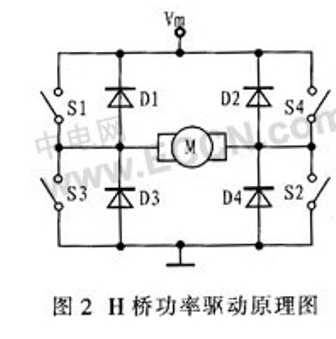 直流電機驅(qū)動使用最廣泛的就是H型全橋式電路,這種驅(qū)動電路方便地實現(xiàn)直流電機的四象限運行,分別對應(yīng)正轉(zhuǎn)、正轉(zhuǎn)制動、反轉(zhuǎn)、反轉(zhuǎn)制動。H橋功率驅(qū)動原理圖如圖2所示。