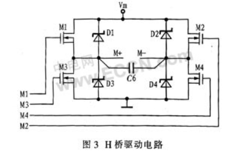 相對來說,利用2個N溝道功率MOSFET和2個P溝道功率MOSFET驅(qū)動電機的方案,控制電路簡單、成本低。但由于加工工藝的原因,P溝道功率MOSFET的性能要比N溝道功率MOSFET的差,且驅(qū)動電流小,多用于功率較小的驅(qū)動電路中。而N溝道功率MOSFET,一方面載流子的遷移率較高、頻率響應(yīng)較好、跨導(dǎo)較大;另一方面能增大導(dǎo)通電流、減小導(dǎo)通電阻、降低成本,減小面積。綜合考慮系統(tǒng)功率、可靠性要求,以及N溝道功率MOSFET的優(yōu)點,本設(shè)計采用4個相同的N溝道功率MOSFET的H橋電路,具備較好的性能和較高的可靠性,并具有較大的驅(qū)動電流。其電路圖如圖3所示。圖中Vm為電機電源電壓,4個二極管為續(xù)流二極管,輸出端并聯(lián)一只小電容C6,用于降低感性元件電機產(chǎn)生的尖峰電壓。
