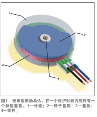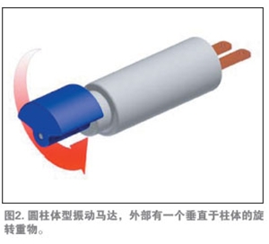 多數(shù)振動(dòng)馬達(dá)由一個(gè)較小的電動(dòng)馬達(dá)驅(qū)動(dòng)一個(gè)偏心配重,如圖1所示。馬達(dá)分為直流有刷或無(wú)刷電機(jī),有兩種基本的結(jié)構(gòu):硬幣狀(扁平)與圓柱形(條狀)。
