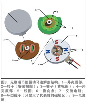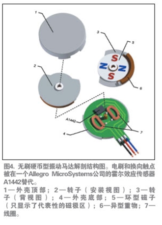 如前所述,無(wú)刷電機(jī)具有較長(zhǎng)的壽命,并由于產(chǎn)生的電火花較少,也沒(méi)有了RFI干擾。無(wú)刷直流(BLDC)設(shè)計(jì)還提供業(yè)內(nèi)直徑最小、厚度最薄的扁平振動(dòng)馬達(dá)。圖4介紹了這種馬達(dá)的基本構(gòu)造。