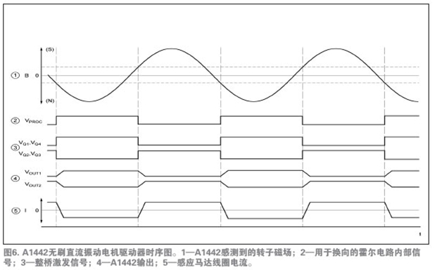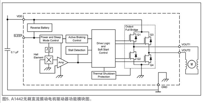 A1442是驅(qū)動(dòng)馬達(dá)唯一必須的的IC。圖5所示的功能模塊圖說(shuō)明了設(shè)備運(yùn)行和先進(jìn)的特性。注意圖4和圖5中,采用集成的霍爾傳感器免除了外部霍爾傳感器,從而減少了馬達(dá)PCB元件數(shù)量。唯一所需的外部元件是一種標(biāo)準(zhǔn)電路特性——位于應(yīng)用馬達(dá)安裝PCB上的0.1µF的旁路電容,它用于降低在開(kāi)關(guān)電源的電感負(fù)載時(shí)產(chǎn)生的瞬時(shí)電壓峰值。