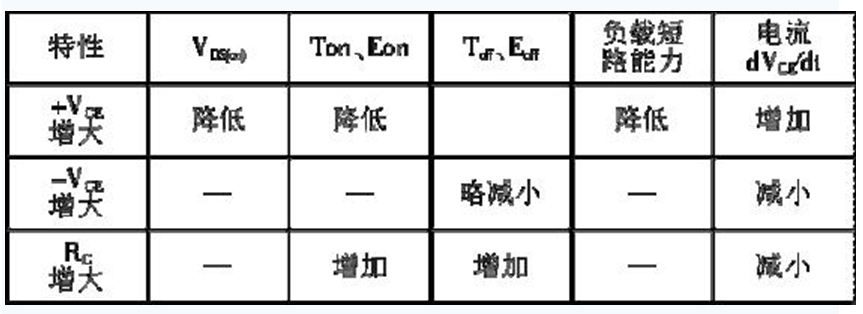IGBT 的驅(qū)動(dòng)條件與它的靜態(tài)和動(dòng)態(tài)特性密切相關(guān)。柵極的正偏壓+VGE、負(fù)偏壓-VGE 和柵極電阻RG 的大小,對IGBT 的通態(tài)電壓、開關(guān)時(shí)間、開關(guān)損耗、承受短路能力以及dVCE/dt等參數(shù)都有不同程度的影響。門極驅(qū)動(dòng)條件與器件特性的關(guān)系如表1 所示。