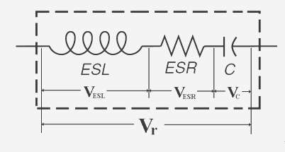 紋波電壓是輸出電壓隨開關(guān)頻率的變化量,是電流中交流成分產(chǎn)生的。如果將電容器的特性參數(shù)等效為電容量C、等效串聯(lián)電阻ESR和等效串聯(lián)電感ESL的串聯(lián),如圖1,