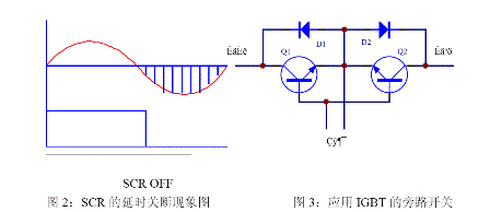 旁路開(kāi)關(guān)常使用繼電器和可控硅。繼電器在中小功率的UPS 中廣泛應(yīng)用。優(yōu)點(diǎn)是控制簡(jiǎn)單,成本低,缺點(diǎn)是繼電器有轉(zhuǎn)換時(shí)間,還有就是機(jī)電器件的壽命問(wèn)題??煽毓璩R?jiàn)于中大功率UPS 中。優(yōu)點(diǎn)是控制電流大,沒(méi)有切換時(shí)間。但缺點(diǎn)就是控制復(fù)雜,且由于可控硅的觸發(fā)工作特性,在觸發(fā)導(dǎo)通后要在反向偏置后才能關(guān)斷,這樣就會(huì)產(chǎn)生一個(gè)最大10ms 的環(huán)流電流,如圖2。如果采用IGBT,如圖3,則可以避免這個(gè)問(wèn)題,使用IGBT 有控制簡(jiǎn)單的優(yōu)點(diǎn),但成本較高。其工作原理為:當(dāng)輸入為正半周時(shí),電流流經(jīng)Q1、D2,負(fù)半周時(shí)電流流經(jīng)D1、Q2。