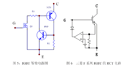 IGBT 有一定抗過(guò)電流能力,但必須注意防止過(guò)電流損壞。IGBT 復(fù)合器件內(nèi)有一個(gè)寄生晶閘管,所以有擎住效應(yīng)。圖5 為一個(gè)IGBT 的等效電路,在規(guī)定的漏極電流范圍內(nèi),NPN 的正偏壓不足以使NPN 晶體管導(dǎo)通,當(dāng)漏極電流大到一定程度時(shí),這個(gè)正偏壓足以使NPN 晶體管開(kāi)通,進(jìn)而使NPN 和PNP 晶體管處于飽和狀態(tài),于是寄生晶閘管開(kāi)通,門(mén)極失去了控制作用,便發(fā)生了擎住效應(yīng)。IGBT 發(fā)生擎住效應(yīng)后,漏極電流過(guò)大造成了過(guò)高的功耗,最后導(dǎo)致器件的損壞。