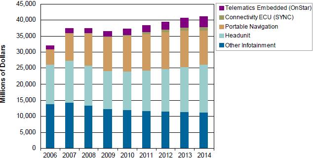 圖1所示為iSuppli公司關于2006-2014年全球汽車信息娛樂系統(tǒng)銷售額的預測。