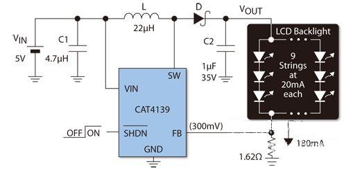 首先計算處理2W的負載需要多大的開關(guān)電流。假定效率為80%,輸入電流等于Vout×Iout/Vin×效率=10×0.18/5×0.8=450mA。CAT4139電感型升壓LED驅(qū)動器具有750mA(最小值)的驅(qū)動能力,故很適合于該應(yīng)用。