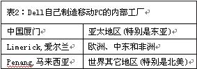 在后端,Dell采用復(fù)雜的按客戶訂單進(jìn)行配置(CTO)的營運模式來支持這種產(chǎn)品定制。對移動PC,Dell有三個內(nèi)部制造工廠來支持它所服務(wù)的主要終端市場。表2所示為Dell自己制造移動PC的內(nèi)部工廠。