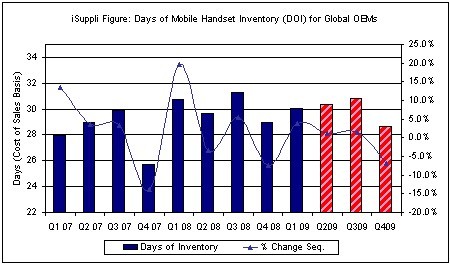 下圖所示為iSuppli公司對(duì)OEM手機(jī)庫(kù)存天數(shù)的預(yù)測(cè)。