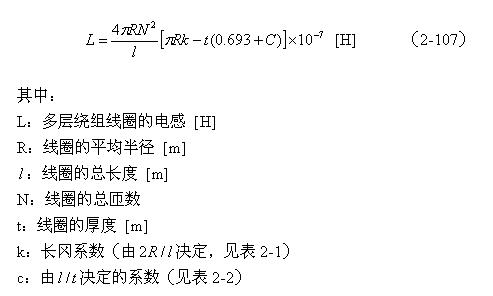 【說明】上式是用來計算多層線圈繞組、截面為圓形的空心線圈的電感計算公式。長岡系數(shù)k可查閱表2-1,系數(shù)c可查閱表2-2。當(dāng)線圈內(nèi)部有磁芯時,有磁芯線圈的電感是空心線圈電感的 倍,