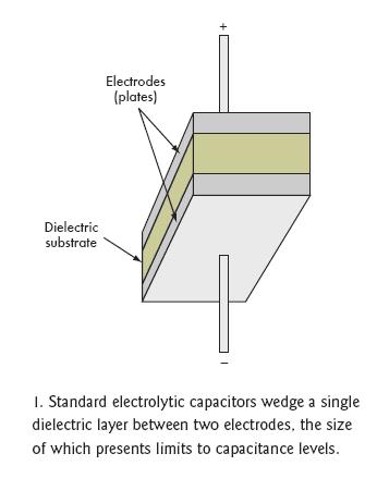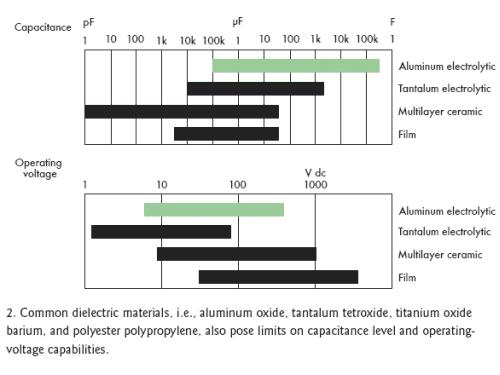 標準電容的結(jié)構(gòu)是在兩個附屬于金屬板上的電極之間夾一層電介質(zhì)層(圖1)。根據(jù)電容類型不同,電介質(zhì)可以是氧化鋁、四氧化鉭、氧化鈦鋇或聚丙烯聚酯,不同的材料決定了不同的容量和電壓特性(圖2)。電介質(zhì)的多少和極板間的距離也會影響電容量。然而,極板間最大允許距離限制了電介質(zhì)的數(shù)量。