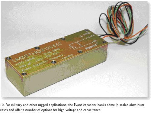EvansCapacitor公司的3STHQ3和3PTHQ3電容組器件則主要用于任務繁重的軍事應用,它將公司的三個THQ3混合電容集成進了一個陽極電鍍、環(huán)氧密封的鋁殼中,整個尺寸為4.47×1.59×1.09英寸(圖10)。針對更高的工作電壓,3STHQ3組可以串聯(lián)電容的方式提供以下四種產(chǎn)品:0.004F/160Vdc,0.0028F/200Vdc,0.0019F/250Vdc和0.0011F/300Vdc。