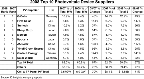 供應(yīng)量位居第三的是上年排名第二的尚德太陽能電力有限公司(Suntech Power Holdings),上年排名第三的夏普以與尚德的0.2個(gè)百分點(diǎn)之差下滑至第四。不過,在銷售額方面夏普位居第三,尚德以0.1個(gè)百分點(diǎn)之差退居第四。IC Insights評(píng)價(jià)夏普的薄膜硅太陽能電池增產(chǎn)及擴(kuò)大銷售的計(jì)劃“很有野心”,并預(yù)測(cè)如果按照計(jì)劃推進(jìn),夏普將有望盡快奪回市場(chǎng)份額。