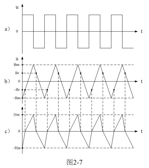 在正常情況下,當(dāng)有交流脈沖電壓輸入時(shí),磁通密度B就會沿著理想磁化曲線d-a,由負(fù)最大值-Bm至正最大值Bm,然后,又由正最大值Bm至負(fù)最大值-Bm,來回地變化;對應(yīng)磁場強(qiáng)度H也是沿著理想磁化曲線d-a由負(fù)最大值-Hm至正最大值Hm,然后,又由正最大值Hm至負(fù)最大值-Hm,來回變化。