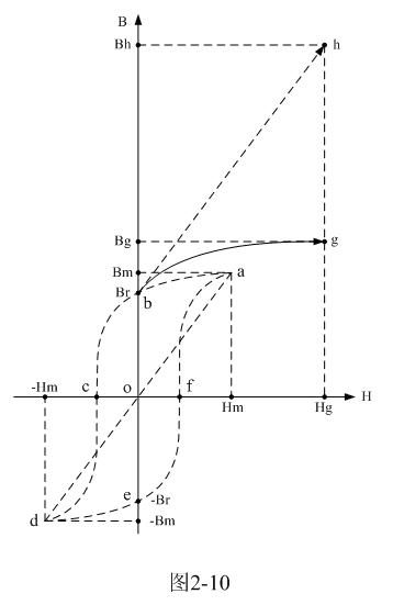 但當(dāng)變壓器鐵芯中的磁化過程是從上次剩余磁通密度Br的位置開始時(shí),上面所分析的理想磁化過程將要被破壞,磁通密度B不會再沿著理想磁化曲線d-a進(jìn)行,而是沿著另一條新的等效磁化曲線進(jìn)行;這條新的等效磁化曲線應(yīng)該與原理想磁化曲線d-a平行,并且經(jīng)過Br點(diǎn),圖2-10中虛線b-h就是這條新的等效磁化曲線的一部分。這里只畫出新等效磁化曲線的一半,另一半在圖2-10中沒有畫出。
