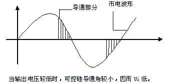 而當(dāng)輸出電壓Uo很低時(shí),可控硅導(dǎo)通角很小,絕大部分市電電壓被可控硅“卡斷了”(如下圖所示),只讓很低的電壓加在變壓器初級,即Ui很低,這當(dāng)然經(jīng)整流濾波后輸出電壓也就很低了。