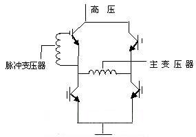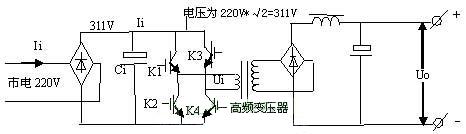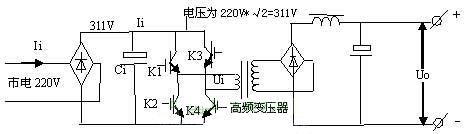由電路可以看出,市電經(jīng)整流濾波后變?yōu)?11V高壓,經(jīng)K1~K4功率開關(guān)管有序工作后,變?yōu)槊}沖信號加至高頻變壓器的初級,脈沖的高度始終為311V。當(dāng)K1,K4開通時(shí),311V高壓電流經(jīng)K1正向流入主變壓器初級,經(jīng)K4流出,在變壓器初級形成一個(gè)正向脈沖。