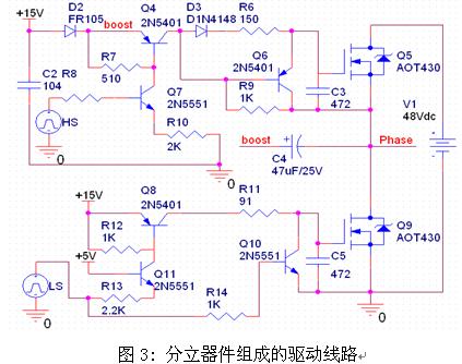 B.分立器件驅(qū)動電路用的器件較多,可靠性相對沒有半橋芯片的驅(qū)動電路高。但前提條件是半橋驅(qū)動芯片的驅(qū)動電路要設計合理。
