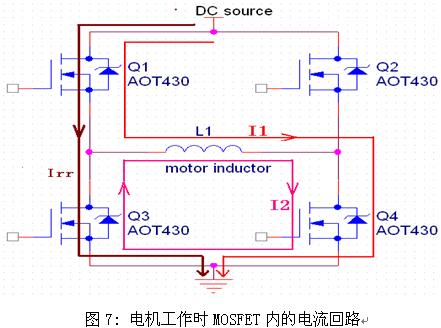 延長MOSFET的開通時間可以減小開通時的涌入電流。由于電機負載為感性負載,所以在PWM關斷時存在續(xù)流現(xiàn)象(見圖7中的I2),為了減小續(xù)流側(cè)反向恢復電流(Irr)的大小,PWM側(cè)開關管的開通速度不宜過快。由于MOSFET處于飽和區(qū)時有公式:Id=K*(Vgs-Vth)2,(K為一常數(shù),由MOSFET的特性決定)。所以在一定的溫度和Vds條件下,從MOSFET的門極驅(qū)動電壓Vgs可以判斷MOSFET中的電流大小。圖5中Vgs峰值為9.1V,圖6中Vgs峰值為6.4V,所以增加電容使得峰值電流減小。Id也可從MOSFET的轉(zhuǎn)移特性圖中獲得。