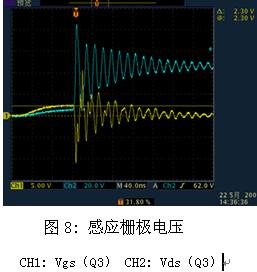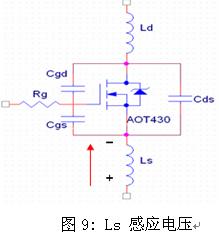 感應柵極電壓如圖8中的CH1所示,其值已達到2.3V。另外,由于源極引線電感的存在,在Q3內(nèi)的電流迅速減小時,會在Ls的兩端感應出一個極性為上負下正的電壓,如圖9所示,此時加在DIE上的電壓Vgs(die)要大于在外部引腳上測量的Vgs電壓,所以由于Ls的影響,使得MOSFET有提前導通的可能。如果下管由于感應電壓而導通,則會造成上下管穿通,如果MOSFET不能承受此穿通電流,MOSFET就會損壞。