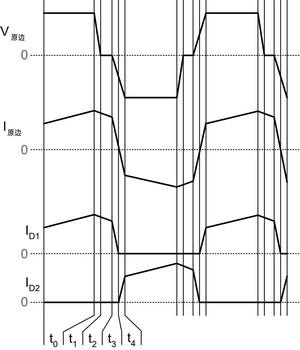 定時間隔基本與標準移相轉(zhuǎn)換周期一致。接通兩個對角開關(guān),給變壓器原邊施加全輸入電壓。電流上升的速率由VIN及串聯(lián)原邊電感決定,不過其初始值為負值,而不是零。電流上升至輸出電流除以變壓器匝比所得之商的水平。