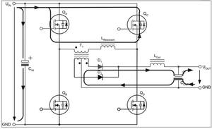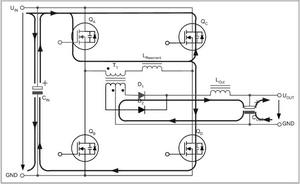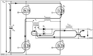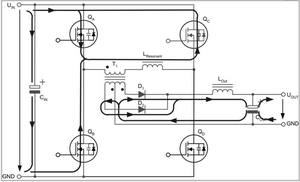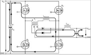 兩個互為對角的全橋開關(guān)不是同時驅(qū)動,而是通過相移的方法在啟動命令之間引入預(yù)定義的短期延遲。這種延遲由控制電路的電壓回路進行調(diào)節(jié),從而在兩個驅(qū)動信號之間產(chǎn)生相移。這種相移技術(shù)的特殊之處在于,它可啟動兩個與變壓器串聯(lián)的開關(guān),而變壓器的電壓卻為零。