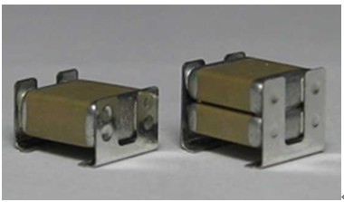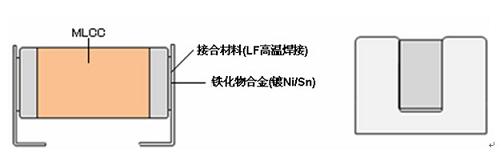 金屬端子通過(guò)接合材料(LF高溫焊接)與電容器的外部電極相結(jié)合,使金屬端子成為接合電路板的媒介。金屬端子的形狀采用能夠降低嘯叫效果的U字形。它只是與電容器上壓電效應(yīng)比較小的WT面外側(cè)部分結(jié)合,從而減低電容器振動(dòng)的傳遞。