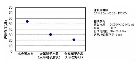 針對(duì)單個(gè)電容器的嘯叫,金屬端子電容器能夠大幅度的降低嘯叫強(qiáng)度。另外,若與使用低介電率材料的陶瓷電容結(jié)合,能更進(jìn)一步降低嘯叫強(qiáng)度。