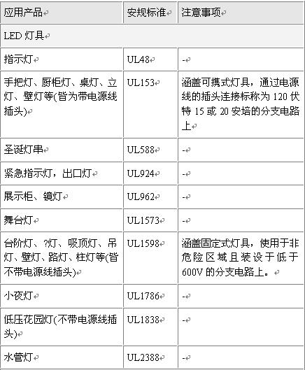 以下首先針對(duì)LED燈具、LED燈泡及LED驅(qū)動(dòng)器等三種基本產(chǎn)品分類,及其分別沿用至各成品或零件時(shí),所應(yīng)參考的UL安規(guī)標(biāo)準(zhǔn)及應(yīng)特別注意事項(xiàng),以做為業(yè)者欲進(jìn)行產(chǎn)品安規(guī)檢測的基本指南。不過該表僅供讀者參考,產(chǎn)品實(shí)際的歸類,仍須依產(chǎn)品的用途及其使用環(huán)境來決定。