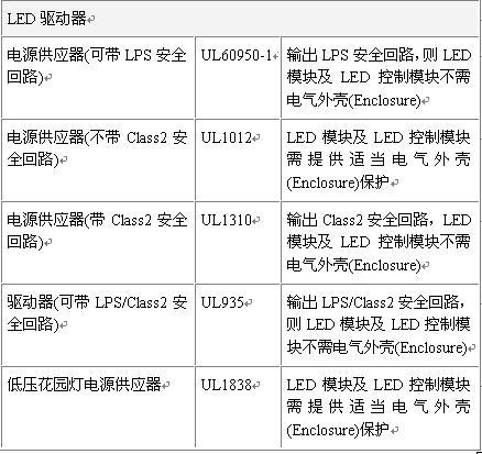 4.其它要求:如LED電源、LED數(shù)組、LED模塊及LED控制模塊等安全及外殼要求等。LED的電源可以是下列標(biāo)準(zhǔn)所驗(yàn)證的電源供應(yīng)器,包括UL1012,UL1310及UL60950-1?;旧希琇ED數(shù)組、LED模塊及LED控制模塊只要位于LPS/Class2安全回路上,就沒有任何電氣外殼的要求。LED燈具對(duì)于電源輸出方式的規(guī)定為基本絕緣,與完全沒有隔離是一樣的。對(duì)于LED數(shù)組、LED模塊及LED控制模塊,如果使用的電源不用大到超過LPS/Class2,建議最好要符合LPS/Class2。反之,若使用的能量將大于LPS/Class2,則有沒有提供隔離一次側(cè)與二次側(cè)電源電路的絕緣,對(duì)塑料外殼的要求上,是沒有差別的。
