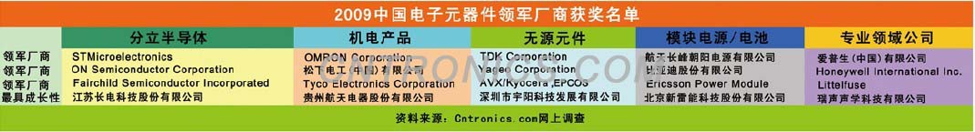 2009中國(guó)市場(chǎng)電子元器件領(lǐng)軍廠商評(píng)選活動(dòng)隆重亮相,在社區(qū)網(wǎng)友的積極參與下,經(jīng)過(guò)激烈的網(wǎng)上投票和打分,令人翹首期盼的獲獎(jiǎng)名單終于震撼登場(chǎng),共有16家中外企業(yè)最終獲得“2009中國(guó)市場(chǎng)電子元器件領(lǐng)軍廠商”稱號(hào),另有五家本土企業(yè)分獲“2009中國(guó)市場(chǎng)電子元器件最具成長(zhǎng)性公司”稱號(hào)。