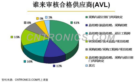 誰(shuí)能審核和最終決定合格供應(yīng)商名單呢?這是電子元器件制造商和分銷商最為關(guān)心的問(wèn)題,從調(diào)查數(shù)據(jù)中可以看出,決策權(quán)并不限于某一個(gè)部門。趨于四成的公司審核和決定合格供應(yīng)商名單(AVL)是由采購(gòu)與設(shè)計(jì)部門共同決定,由采購(gòu)部門單獨(dú)決策的不足一成;而由研發(fā)部門單獨(dú)決策的僅為15%,由此可見(jiàn),在電子產(chǎn)品開(kāi)發(fā)速度加快和上市時(shí)間日趨壓縮的背景下,電子行業(yè)的采購(gòu)與研發(fā)的合作關(guān)系日趨緊密,采購(gòu)部門更多的參與到產(chǎn)品開(kāi)發(fā)的過(guò)程中,在提供成本預(yù)測(cè)、確定替代供貨源和降低成本方面扮演著重要角色。此外,通過(guò)調(diào)查還發(fā)現(xiàn),多個(gè)部門共同決定元器件采購(gòu),已經(jīng)成為業(yè)界采購(gòu)流程的發(fā)展趨勢(shì)。除研發(fā)和采購(gòu)部門外,公司總經(jīng)理等決策高層也更多的關(guān)注和參與到電子元器件采購(gòu)中。