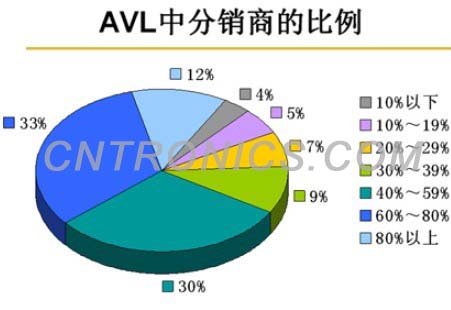 在合格供應(yīng)商清單(AVL,Approved Vendor List)中,有超過(guò)1/3的電子整機(jī)廠商的AVL中分銷商比例超過(guò)六成,1/3的整機(jī)廠商的AVL中分銷商占據(jù)半壁江山。總體有超過(guò)2/3的整機(jī)廠商中有一半的產(chǎn)品供應(yīng)來(lái)自分銷商??梢?jiàn)分銷商在電子元器件供應(yīng)鏈中扮演重要角色。