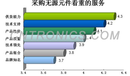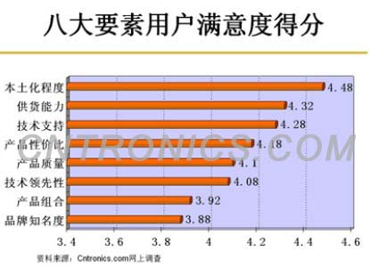 從柱狀圖可以看出,性價(jià)比、技術(shù)支持和供貨能力普遍得分很高。而產(chǎn)品組合和品牌知名度普遍得分較低。由此可見(jiàn),在金融危機(jī)影響依然持續(xù)的情況下電子整機(jī)廠商更加重視電子元器件的供貨能力和技術(shù)支持能力。[page]