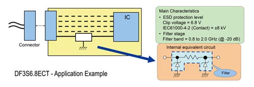 東芝美國電子元器件公司(TAEC)最新推出具有靜電放電(ESD)保護和電磁干擾(EMI)濾波的二極管。東芝DF3S6.8ECT保護二極管提供數(shù)字和移動器件如:手機,PDA,筆記本電腦,數(shù)碼相機,以及具有EMI和ESD保護的GPS設備,這些靜電放電能源通過用I/O端口和通過連接器進入到系統(tǒng)電路板上。