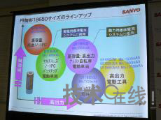 圖4:三洋電機(jī)移動能源公司業(yè)務(wù)開發(fā)統(tǒng)括部統(tǒng)括部長雨堤徹 圖5:通用圓筒形單元(18650)的產(chǎn)品陣容。根據(jù)用途區(qū)分使用