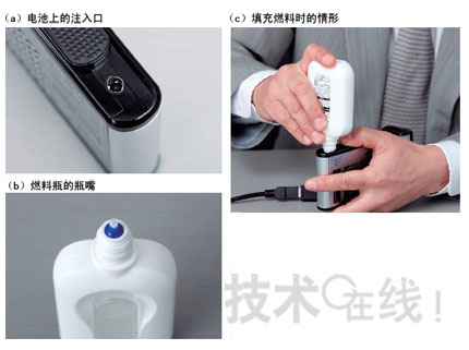 從位于底部的注入口向燃料電池填充燃料(a)。50mL裝燃料瓶由東洋制罐制造(b)。將瓶嘴插入電池的燃料注入口,只有對準時,瓶嘴才會插入注入口里面注入燃料(c)。