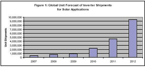 - 2012年全球用于太陽能系統(tǒng)的逆變器出貨量將從2008年時的723,329個增長到950萬個