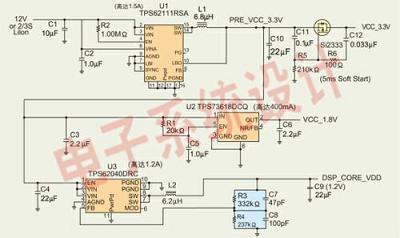 我們構(gòu)建了若干個(gè)電源管理參考設(shè)計(jì),并進(jìn)行數(shù)字音頻/視頻應(yīng)用的測試。這些設(shè)計(jì)均采用TI的TMS320DM6?43和TMS320DM6?46處理器,這些處理器能滿足排序、電壓精度和啟動(dòng)要求。圖1是12V電源的參考設(shè)計(jì)電路圖。該設(shè)計(jì)采用TPS62111同步降壓轉(zhuǎn)換器、TPS62040同步降壓轉(zhuǎn)換器以及TPS73618低壓降調(diào)節(jié)器,它們分別提供3.3V、1.2V和1.8V電壓軌。這種參考設(shè)計(jì)包含一個(gè)簡單的外部MOSFET、電阻和電容延遲電路,以使3.3V電壓軌能滿足自升壓模式排序方案要求。TPS62040不但提供1.2V的內(nèi)核電壓,而且還可滿足引腳5軟啟動(dòng)電容的排序要求。這種解決方案的容差為±3%,效率在90%以上。為滿足主機(jī)升壓模式排序方案要求,可以將一個(gè)類似的MOSFET、電阻以及電容電路增加到1.2V電壓軌。