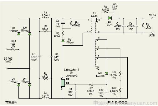 圖2是一款5W通用輸入恒壓/恒流(CV/CC)充電器/適配器的電路設(shè)計圖。本設(shè)計適用于手機(jī)電池充電器、USB充電器或任何有恒壓/恒流特性要求的應(yīng)用。該電路可為最高1A的負(fù)載提供5V恒流輸出,精度為±5%。當(dāng)需要更大負(fù)載時,電源將進(jìn)入恒流模式,輸出電壓降低,使輸出電流維持在1A±10%。