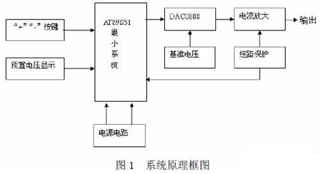 本系統(tǒng)是以AT89S51 單片機為核心控制器,具有電壓可預置、可步進調整、輸出的電 壓信號和預置的電壓信號可同時顯示的數控直流電源,其硬件原理方框圖如圖1 所示。系統(tǒng) 由AT889S51 控制電路、鍵盤電路、電源電路、D/A 電路、功放電路、短路保護及報警電路、 穩(wěn)壓輸出電路、LED 顯示電路八部分組成。系統(tǒng)通過“開關”、“+”、“-”三個按鍵來控制預置電壓的升降,并通過數碼管顯示。AT89S51 單片機送出相應的數字信號,在D/A 轉換之 后輸出電流,經集成運放LM358 轉換、三極管放大、RC 網絡濾波,最終穩(wěn)定。同時由LED 數碼管顯示輸出電壓;由數字電壓表測量實測值。