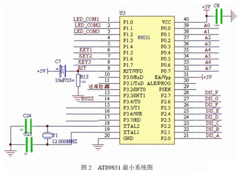主要由AT89S51 最小系統(tǒng)控制,它要完成鍵盤控制、預置電壓顯示控制、短路保護控制 及報警控制等功能。AT89S51 最小系統(tǒng)如圖2 所示。
