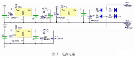 電源部分輸入220V、50Hz 交流電,輸出全機所需的三種電壓:+5V、+15V、-5V,主要供數控部分和D/A 轉換芯片使用;+15V 作為運放的正電源,同時也是穩(wěn)壓輸出電路的主電源。該電源模塊部分拓展了-5V 負電壓,同時作為運放的負電源,如圖5 所示。